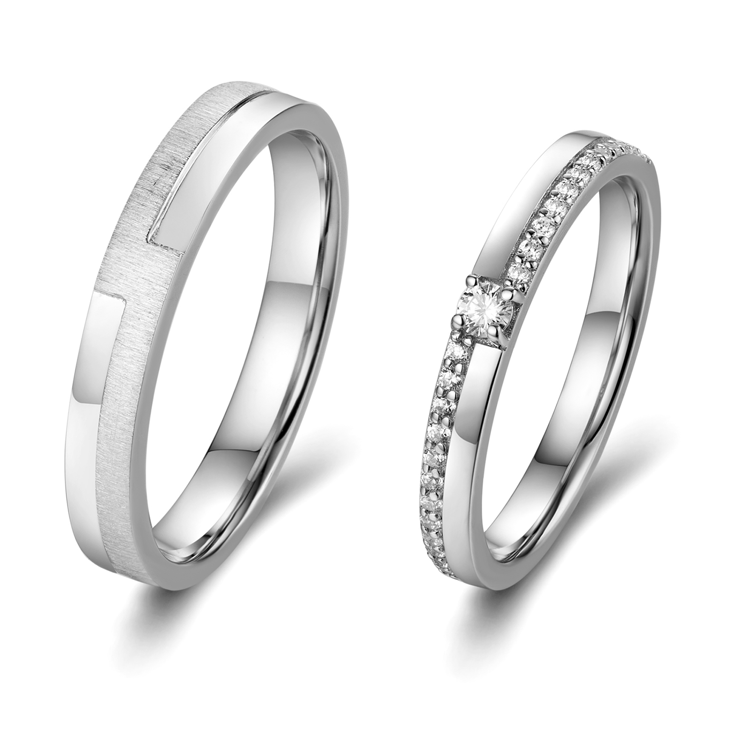 18K white color gold diamond couple ring embellished with 1pc (0.104cst) sparkling diamonds (Female) and 18K white color gold ring(Male)