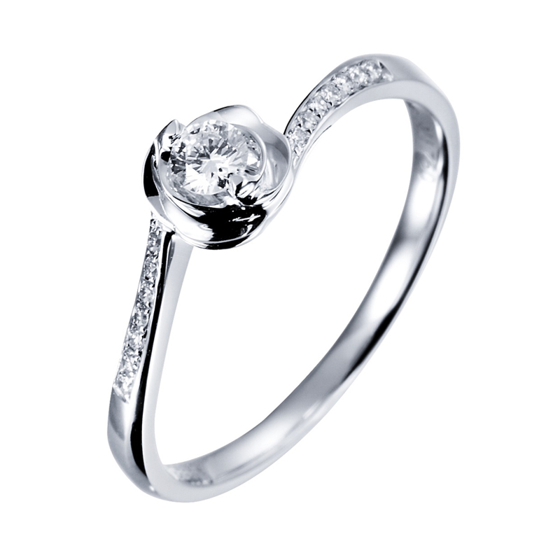18K白金鑽石戒指,玫瑰形鑲托上鑲有1顆0.083ct鑽石,戒指兩旁襯托14顆合共0.035ct閃亮鑽石。 古雅優雅。