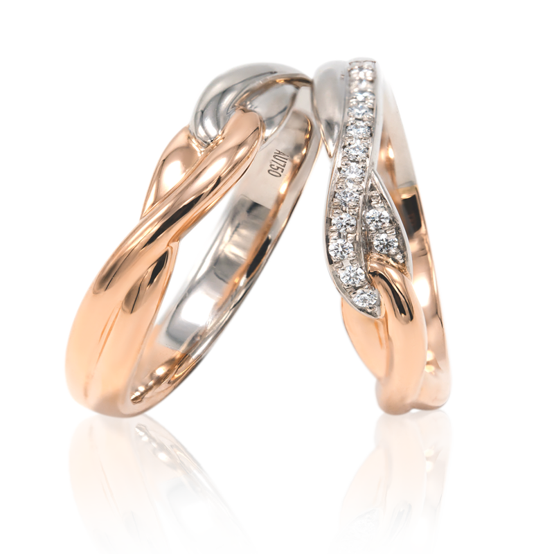 18K Rose Gold/White Color Gold diamond couple ring embellished with 14pcs Grunberger Diamond total at 0.050cts (Female) and 1pc Grunberger Diamond at 0.005cts (male)