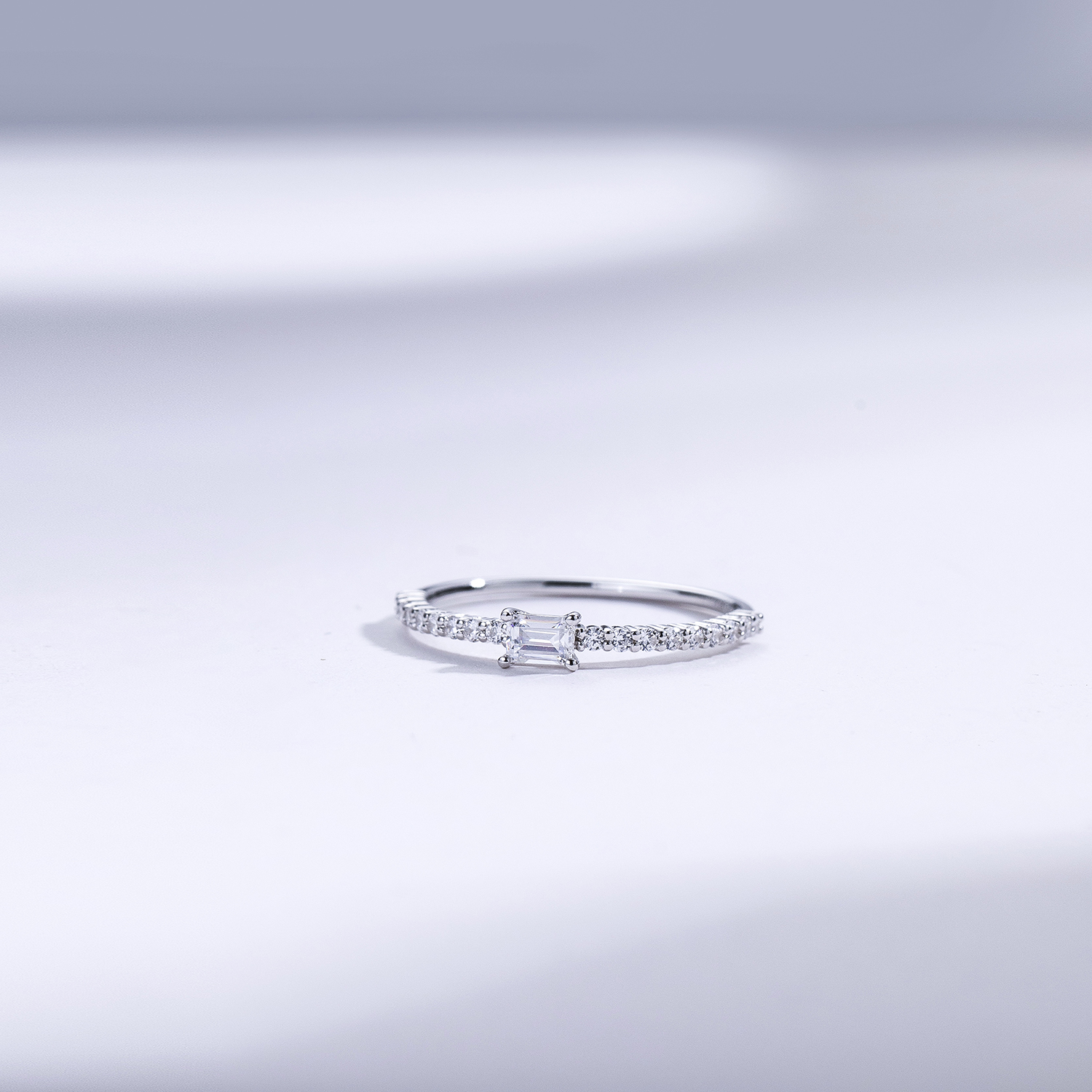 Female: Embellished with one center stone of baguette diamond total at 0.250cts, and 18 pcs of round diamonds at its side total at 0.285cts. – For PT950 white color gold diamond ring