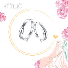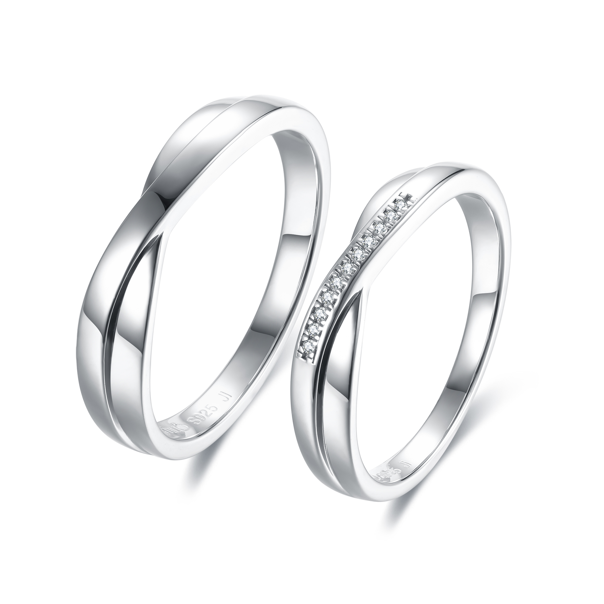 18K 白色黃金鑽石對戒,女戒鑲嵌11顆合共0.030ct閃爍鑽石及18K 白色黃金男戒。PT950鉑金對戒