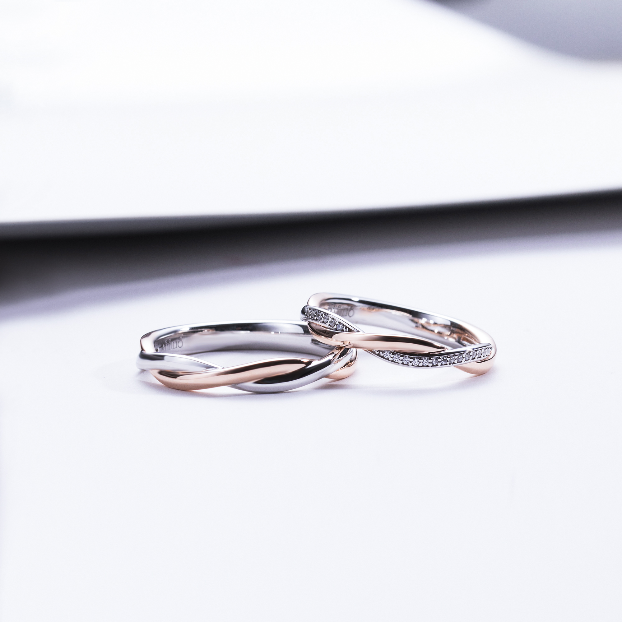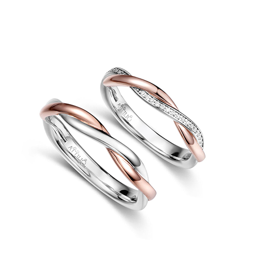 18K红白色黃金鑽石對戒, 女戒鑲嵌22顆合共0.10cts閃爍鑽石及18k红白色黃金男戒. PT950鉑金對戒