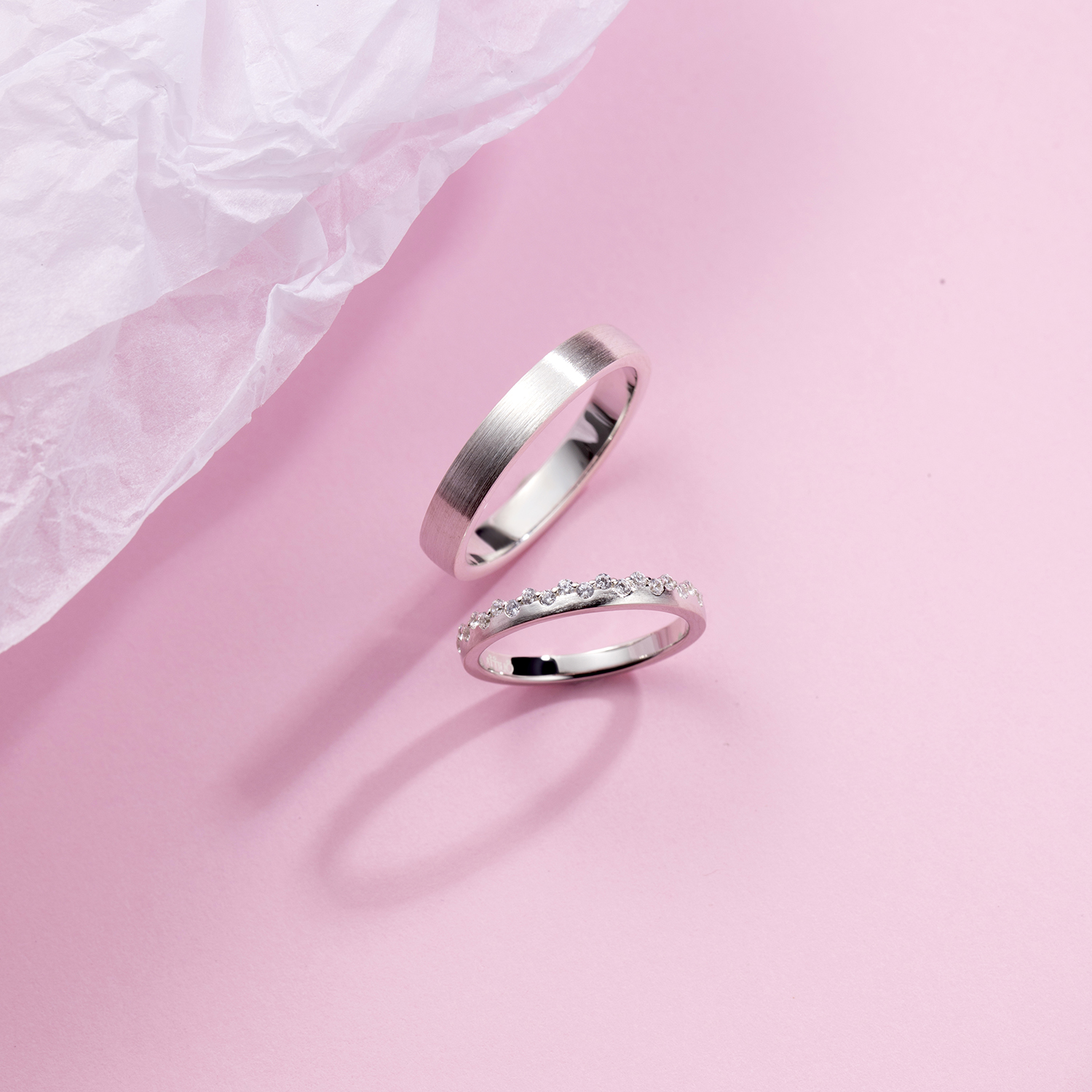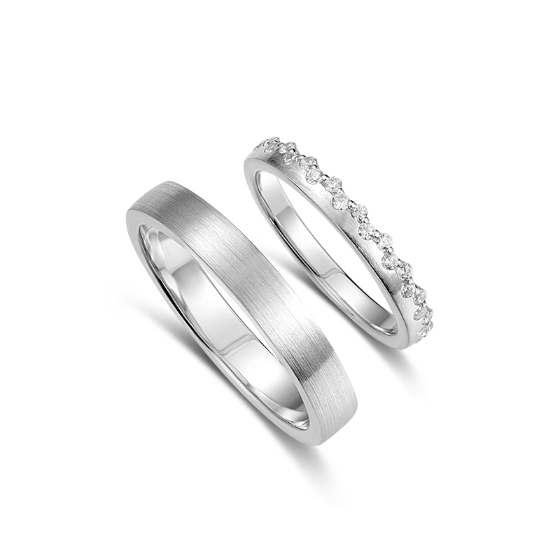18K white color gold diamond couple ring embellished with 21pc (0.210cts) sparkling diamonds (Female) and 18K white color gold ring(Male) . For PT950 white color gold diamond ring